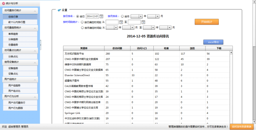 點(diǎn)擊菜單【統計與分析>>用戶(hù)行為分析>>用戶(hù)訪(fǎng)問(wèn)量排行】,打開(kāi)用戶(hù)訪(fǎng)問(wèn)量排行表的設置頁(yè)面。用戶(hù)訪(fǎng)問(wèn)量排行可以詳細了解每一位用戶(hù)的總訪(fǎng)問(wèn)量,并且可以了解其檢索和下載等行為的次數。查看排行時(shí),選擇相應的時(shí)間段即可統計(如下圖)。