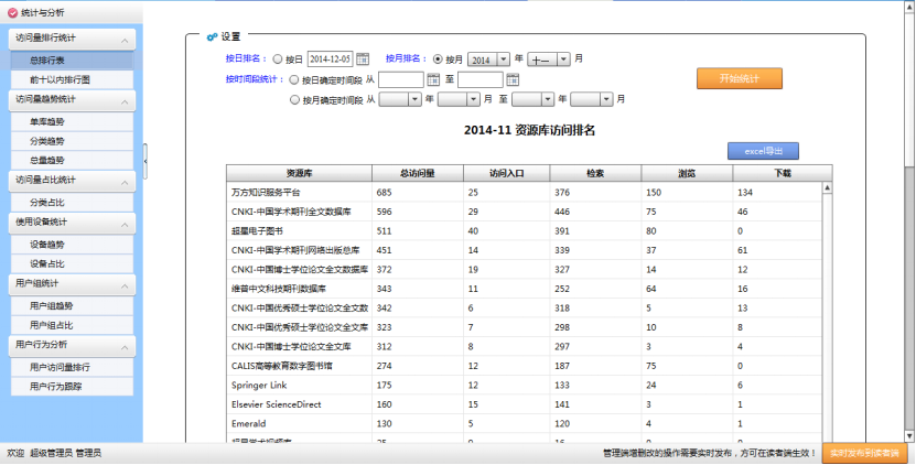 點(diǎn)擊菜單【統計與分析>>訪(fǎng)問(wèn)量排行統計>>總排行表】,打開(kāi)總排行表的設置頁(yè)面。統計的時(shí)間范圍設置非常靈活,可以具體到某一天,可以是某一個(gè)月,即按日排名和按月排名。支持按時(shí)間段統計排名,可以按日確定時(shí)間段,也可以按月確定時(shí)間段。按日確定時(shí)間段滿(mǎn)足了各種不是整月整年的時(shí)間范圍統計,而按月確定時(shí)間段能滿(mǎn)足整月、半年、一年,或者是幾年的統計時(shí)間范圍的需求。
