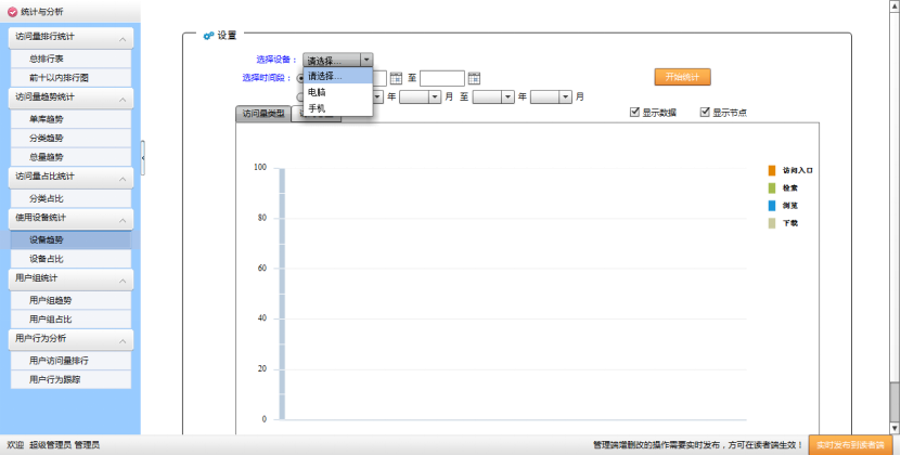 點(diǎn)擊菜單【統計與分析>>訪(fǎng)問(wèn)量趨勢統計>>單庫趨勢】,打開(kāi)單庫趨勢圖的設置頁(yè)面(如下圖)。